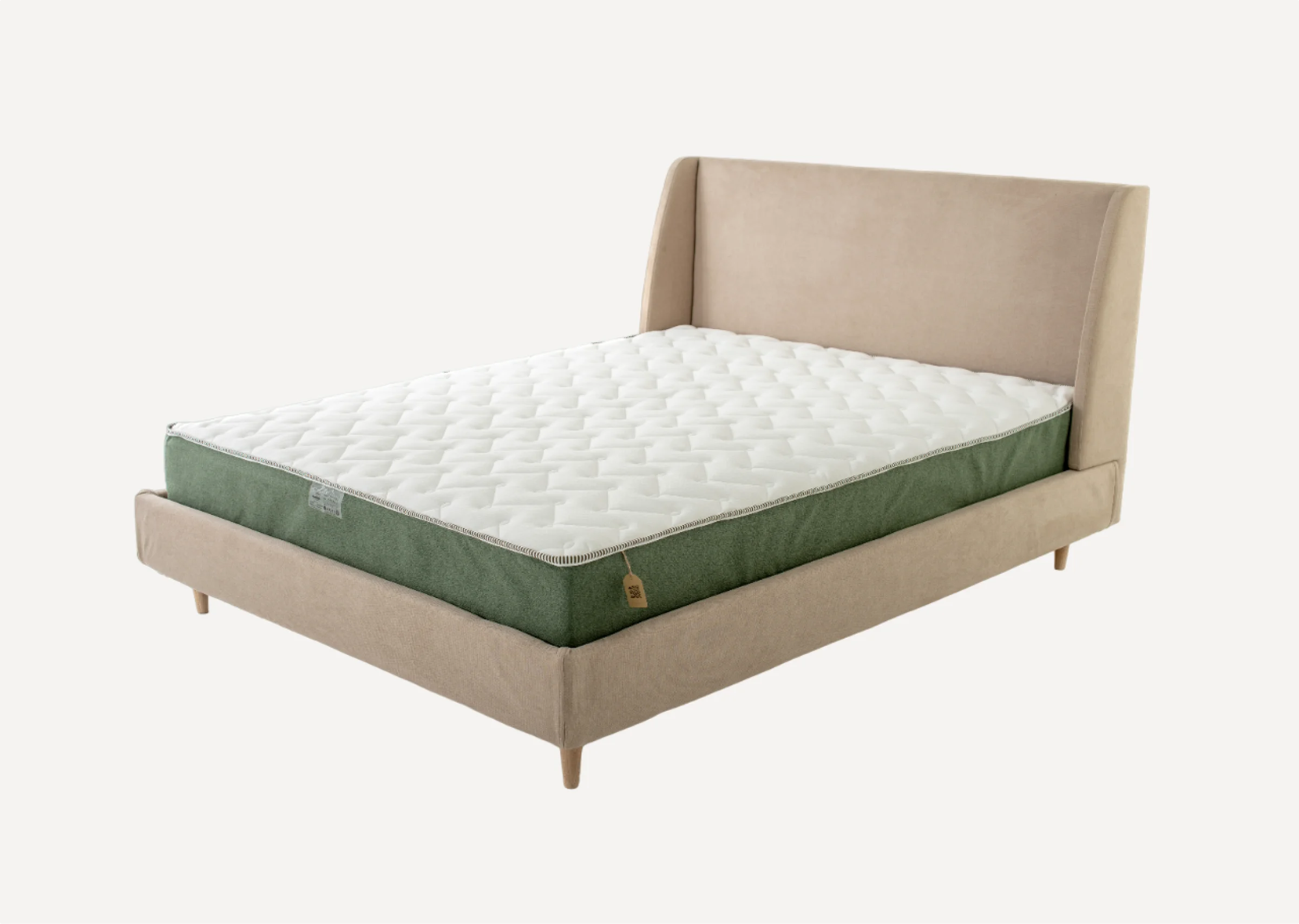 Опоры кровати из массива бука обеспечивают прочность и высокий просвет над полом (165 мм), облегчая уборку и создавая стильный образ. Съемный чехол на царгах позволяет легко чистить и формирует аккуратный угол на стыке царг. Каркас кровати, изготовленный из ДСП, ДВП и брусков, является надежным и долговечным. Внутренняя сторона царг закрыта спанбондом, придавая эстетичный вид. Все соединения болтовые, защищая материалы от разрушения и обеспечивая возможность повторной сборки. Кровать устанавливается на опоры из массива бука высотой 170 мм. Спинка кровати изготовлена из ДСП, брусков хвойных пород дерева и ДВП, оклеена поролоном толщиной 20 мм. Форма изголовья с компактными «ушками» придает кровати уютный вид и формирует удобное спальное место, оставаясь компактной. Царги и спинка соединяются при помощи металлического уголка.